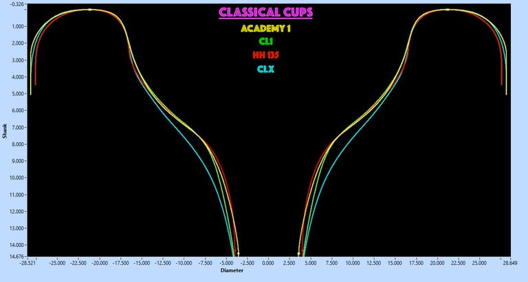 CLX - This is a C / Convex-V hybrid cup. It's pretty deep by trumpet standards but has a weighty sound profile and is just efficient and fun to play. This is a wonderful option for Posthorn Solos and when you want a more "Rotary Trumpet" sound.