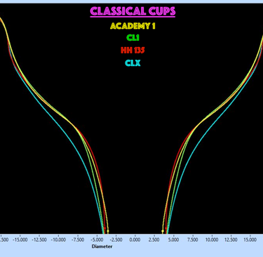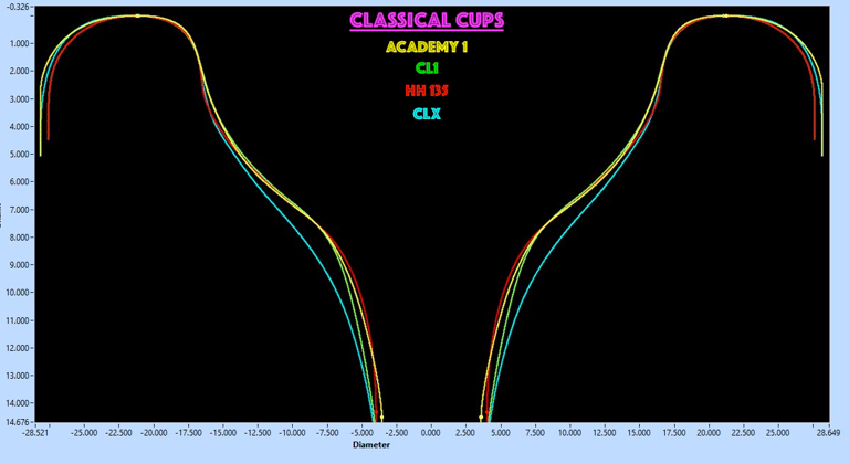 The Academy has the smallest cup volume, but only by a whisker, and the CL1 & HH 135 are very close as well. The big difference is in the sound shape and articulation.